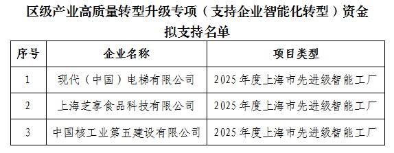 金山区2026年级产业高质量转型升级专项(支持企业智能化转型)资金拟支持名单公示